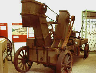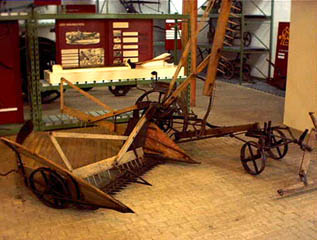 Um 1850 kam der Flügelmäher (Ablegmäher) auf den Markt. Er legte das geschnittene Korn garbenweise in die Fahrspur bereit. Das Binden blieb Handarbeit. |