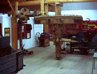Holzgetriebe eines Göpels diente zum Antrieb diverser ländlicher Maschinen und wurde mit Tieren in Bewegung gehalten. |